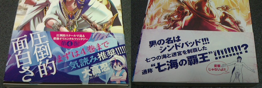 いつもサンデー買ってる書店のマギのコミックスの所にあるPOPが「アニメ化キター!」の文字(+顔文字)だけだったんですが、こんなやる気のねえPOP初めて見た(笑)アニメ化の帯を見てて思いましたが、コミックスの帯って時期によって変わるんですよね。ふと思い立ったので、私が買った時の帯を写メってみようか。(4巻発売頃から買い始めて、1~3巻は帯なかった)画像クリックで拡大します。
